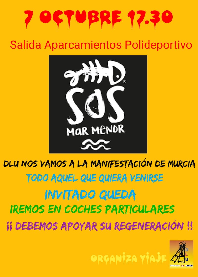 El partido DLU (Defiende La Unión) convoca a la ciudadanía para apoyar la manifestación por el Mar Menor a celebrar el 7 de octubre, a partir de las 17.30 horas, en Murcia. Además, anuncian que preparan otra concentración, pero en La Unión y para reivindicar que vuelvan los trabajos a la bahía.