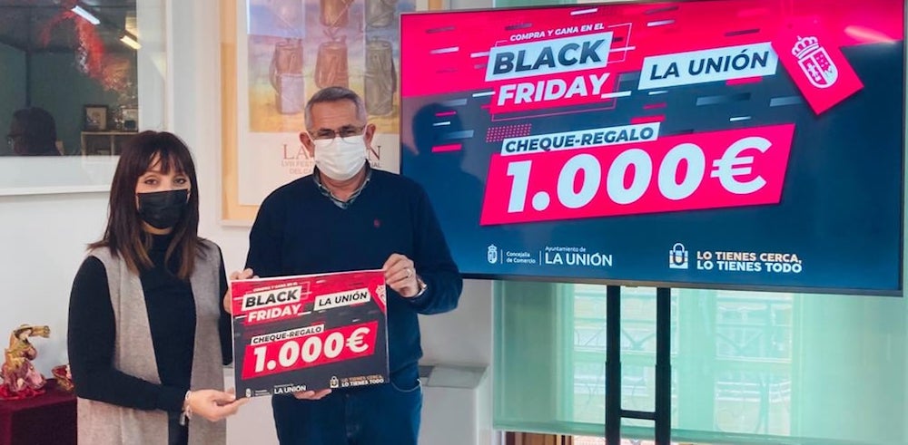 Anabel Belchí Sánchez, ganadora de los 1.000 euros del 'Black Friday' de La Unión, ha recogido de manos del alcalde, Pedro López Milán, el vale para gastar en los comercios adheridos a la campaña, con un importe máximo de 250 euros por establecimiento.