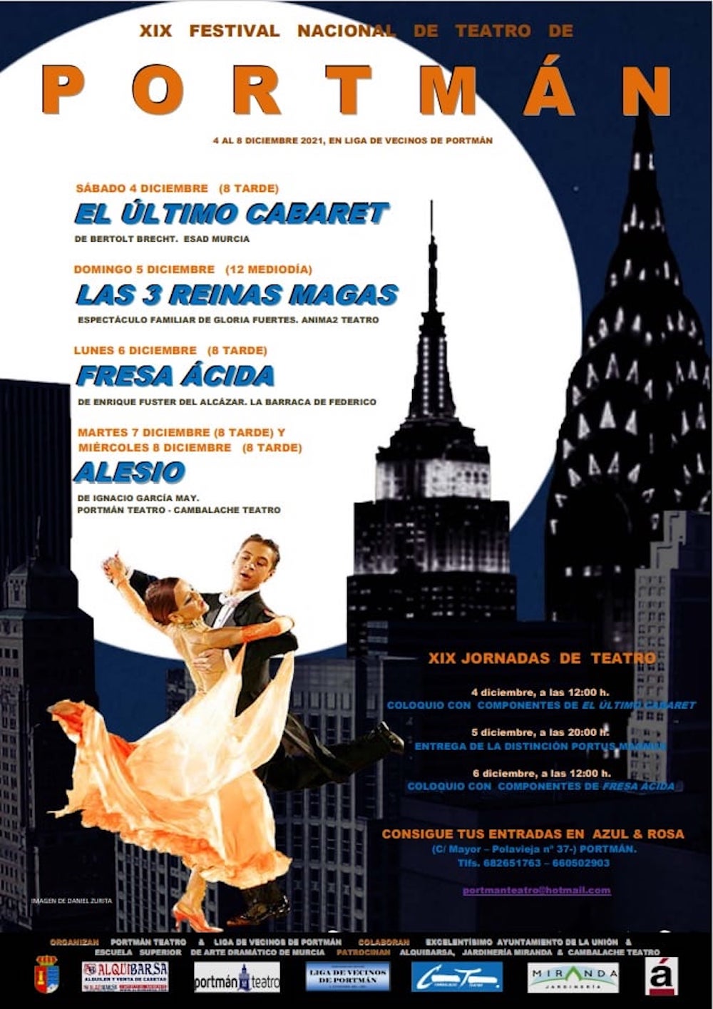 La décimo novena edición arranca hoy, a las 20 horas, en la Liga de Vecinos con la obra ‘El último cabaret’, a cargo de la Escuela de Arte Dramático de Murcia. Los siguientes días hasta el miércoles irán pasando pro el escenario ‘Las 3 reinas magas’, ‘Fresa ácida’ y ‘Alesio’, mientras que en las actividades paralelas hay dos coloquios y la entrega del galardón ‘Portus Magnus’.