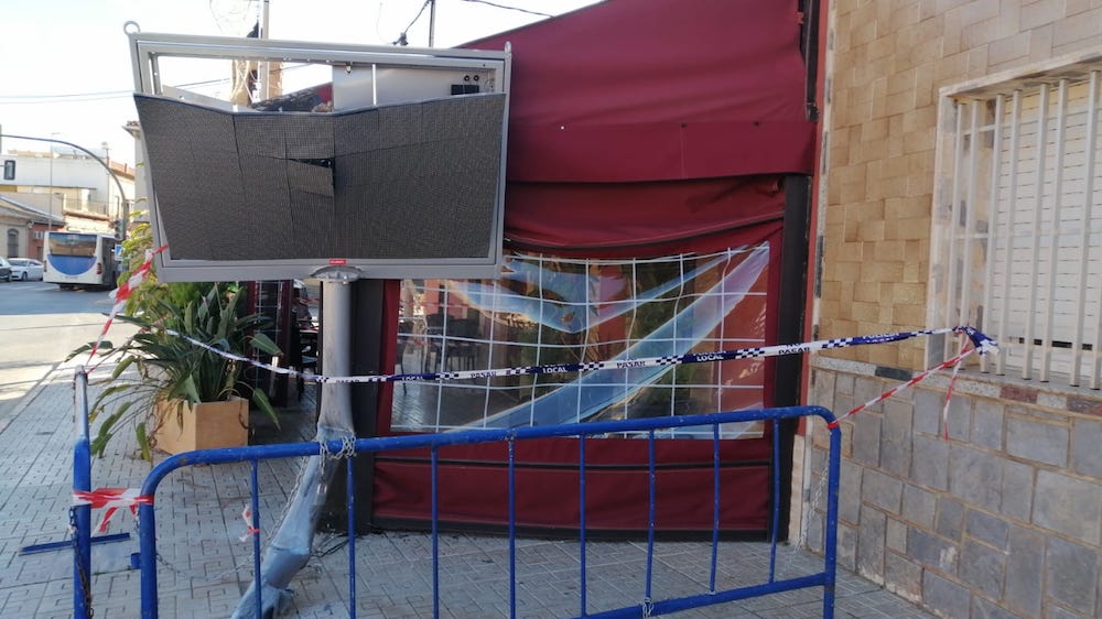 Un turismo, por causas que se desconocen, colisionó esta pasada madrugada con un poste informativo del Ayuntamiento y parte de la terraza del Café del 33, en El Garbanzal, como muestran estas fotos que circulan por redes sociales y han sido enviadas a nuestra redacción. En el lugar se personó la Policía Local de La Unión y no hubo que lamentar daños personales, según informan desde el servicio de Emergencias 1-1-2.