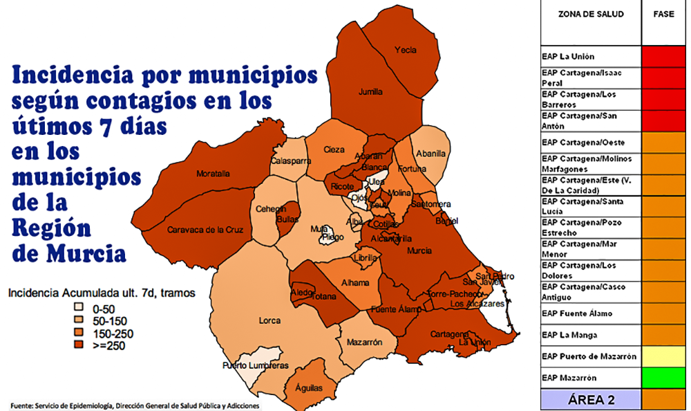 La incidencia del coronavirus en el territorio autonómico, al igual que en el resto de España, sigue disparado y ya hay que mirar a enero de 2021 para ver unos datos similares. Los datos publicados hoy señalan 1.232 nuevos infectados en la Región de Murcia, siendo casi siete mil los enfermos activos. En nuestro municipio son 135 los detectados en los últimos 7 días y el centro de salud sigue en nivel rojo de riesgo alto. Respecto a los cuatro fallecidos ayer en la Región, señalar que tres no estaban vacunados y que uno tenía 44 años de edad.