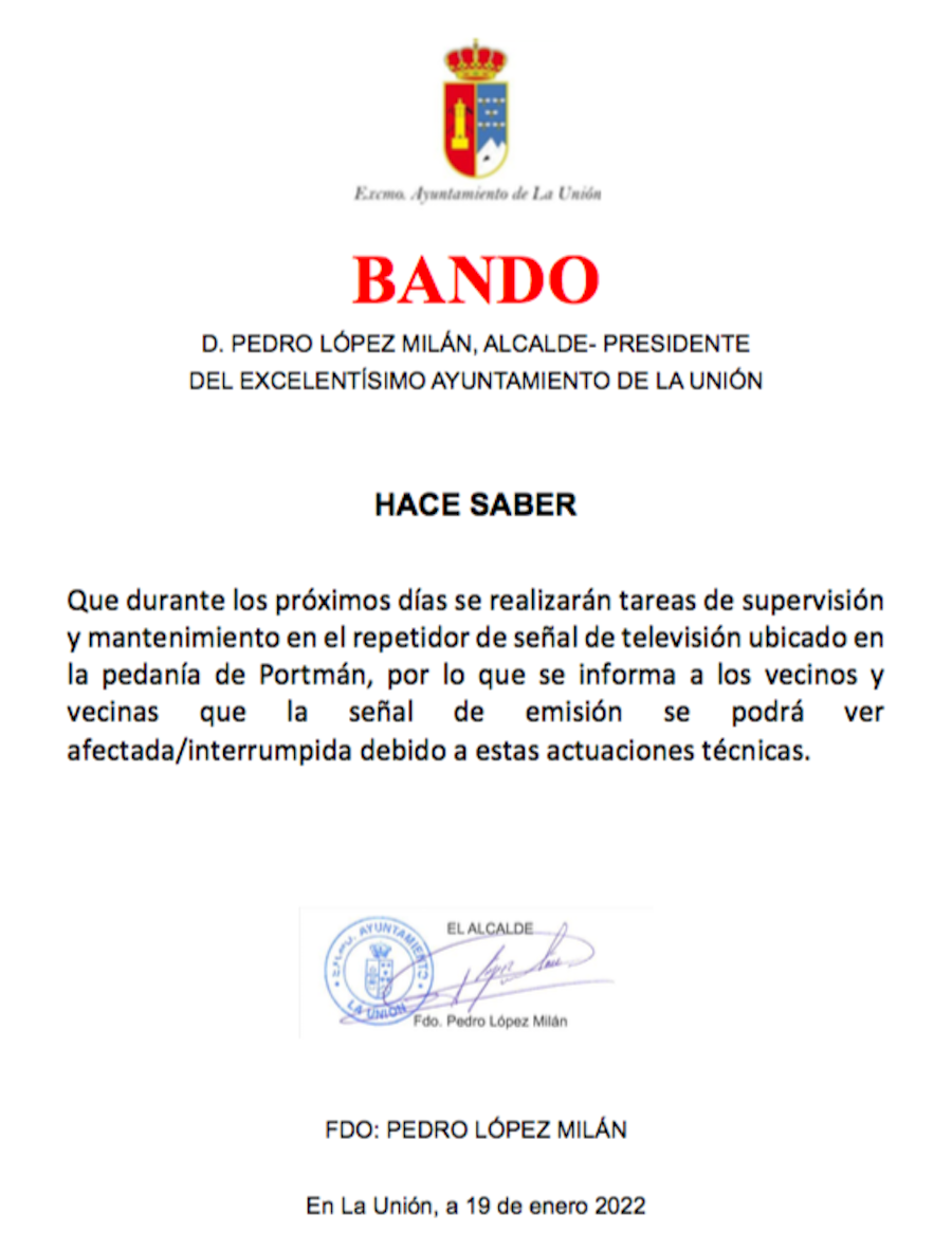 El alcalde, a través de un bando, informa a los vecinos de la pedanía costera que, debido a tareas de supervisión y mantenimiento, la señal podría verse afectada en los próximos días.