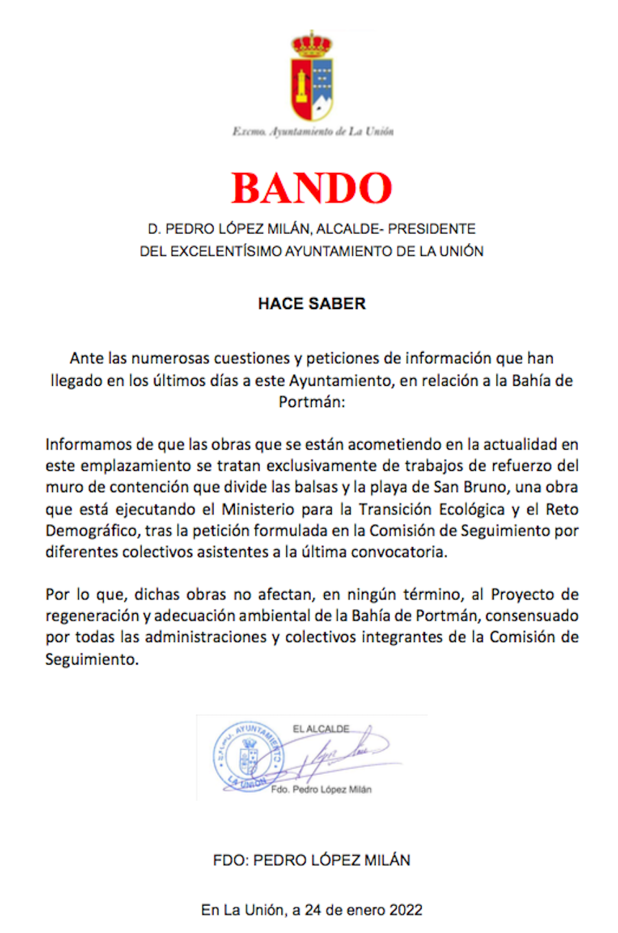 Ante las numerosas cuestiones y peticiones de información que han llegado en los últimos días al Ayuntamiento de La Unión en relación a la Bahía de Portmán, el alcalde, Pedro López Milán, informa de que las obras que se están acometiendo en la actualidad en este emplazamiento se tratan exclusivamente de trabajos de refuerzo del muro de contención, una obra que está ejecutando el ministerio para la Transición Ecológica y el Reto Demográfico, tras la petición formulada en la comisión de seguimiento por diferentes colectivos asistentes a la última convocatoria.