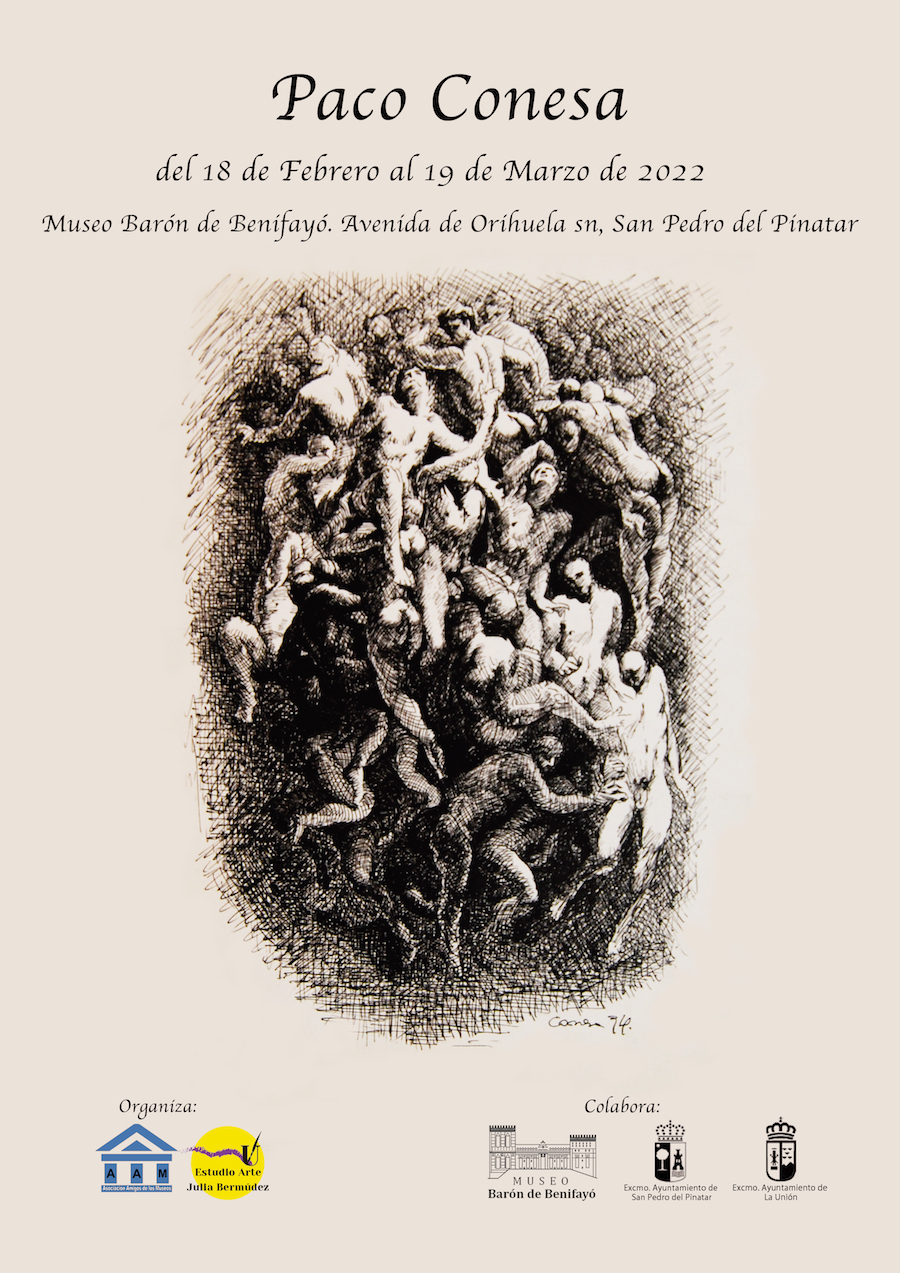 La Asociación de Amigos de los Museos, encabezada por su presidente Julián Olmos, ha organizado junto al Estudio de Arte Julia Bermúdez una muestra sobre la obra del polifacético artista unionense Paco Conesa. El que fuera escenógrafo, imaginero, pintor o miniaturista volverá a ver expuestas sus creaciones en el incomparable marco del Museo Barón de Benifayó (San Pedro del Pinatar).