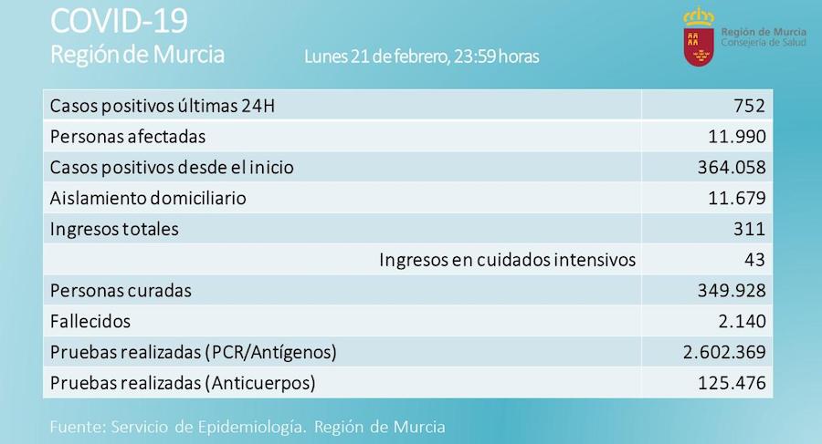 De los 752 nuevos casos, 245 corresponden al municipio de Murcia, 97 a Cartagena, 36 a Lorca, 32 a Molina de Segura, 29 a Cieza, 25 a San Javier, 25 a Ceutí, 24 a Águilas, 23 a Torre pacheco, 17 a Totana y 16 a La Unión. El resto están repartidos por los demás municipios.