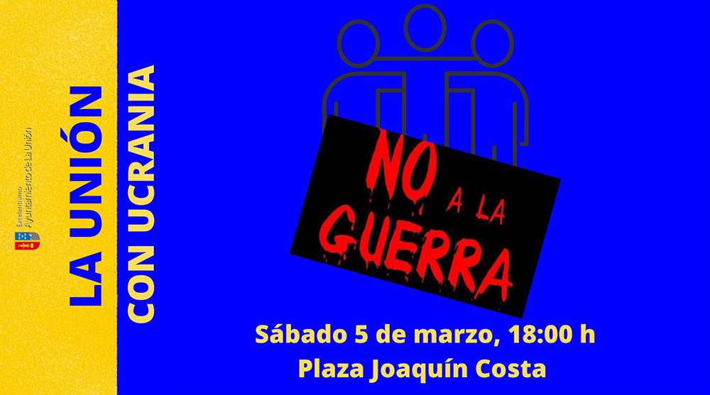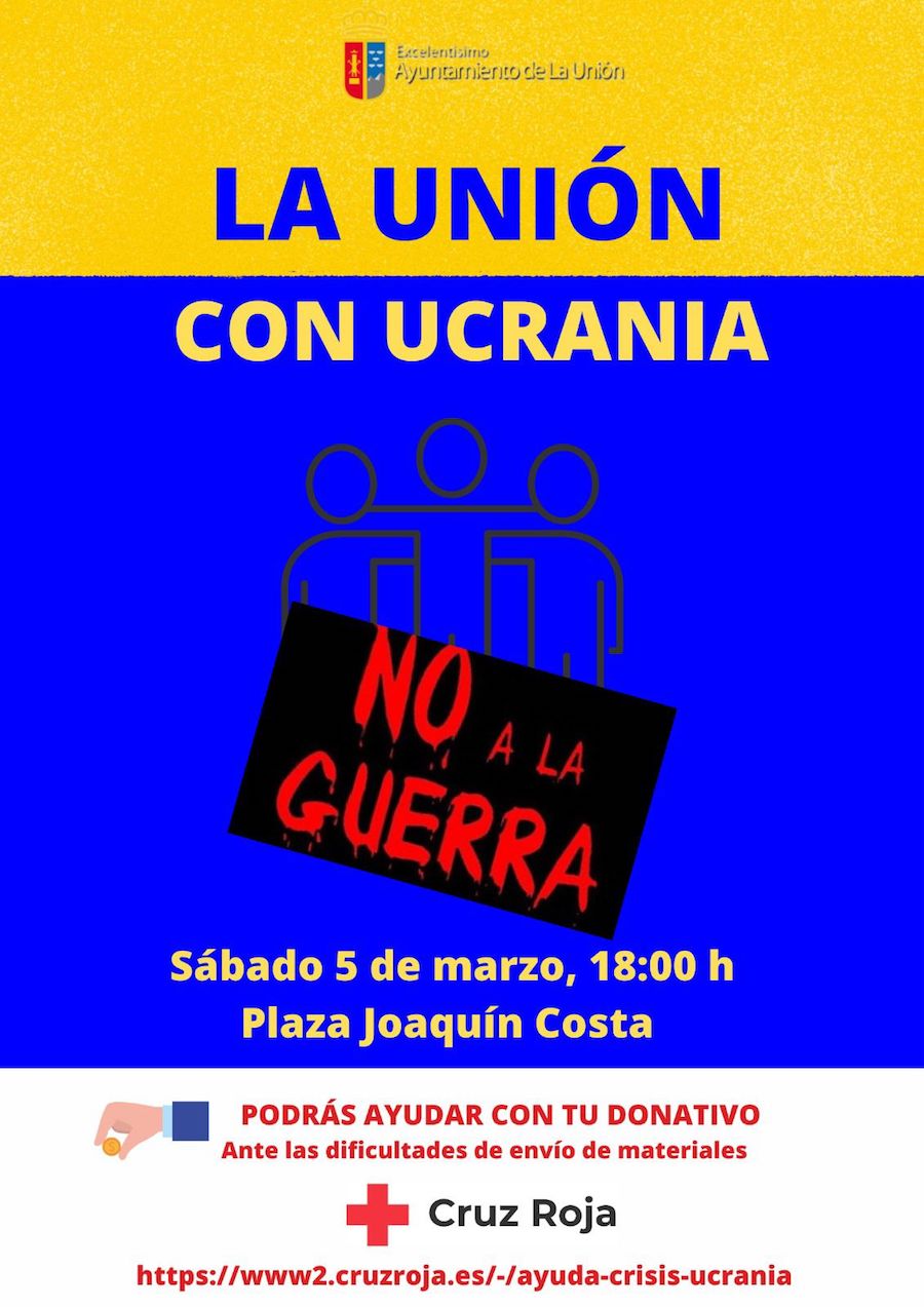 El Ayuntamiento de La Unión condena enérgicamente el conflicto bélico que sufre Ucrania y se solidariza con su pueblo convocando para este sábado a los unionenses a una concentración en apoyo a la comunidad ucraniana, durante la que se podrán aportar donativos para que Cruz Roja Internacional pueda seguir realizando su labor humanitaria en las zonas de conflicto.