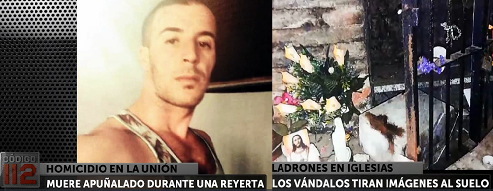 El programa de sucesos y tribunales de la televisión autonómica 7RM ofrece sendos reportajes relacionados con nuestros municipio. Por un lado, la muerte de una persona hace diez días tras una reyerta, lo que, por lo que dicen algunos vecinos, no pilló por sorpresa, pues se habían producido conflictos anteriores. El otro asunto son los daños que ocasionan los vándalos a la capilla popular creada por un vecino en 1984 en el Camino del 33, siendo la última actuación hace unas fechas, rompiendo imágenes (incluida una Virgen del Rosario) y una cruz, entre otros.