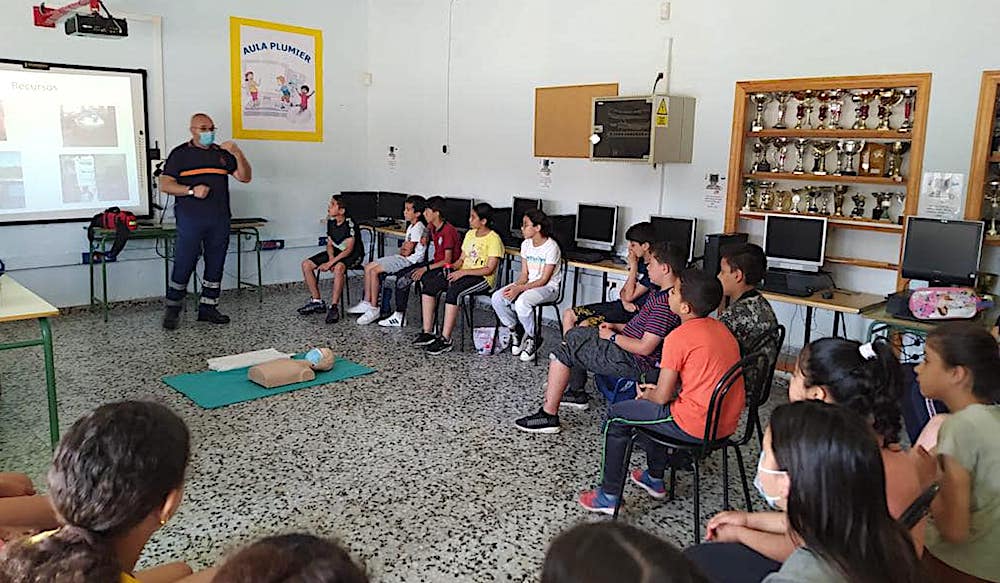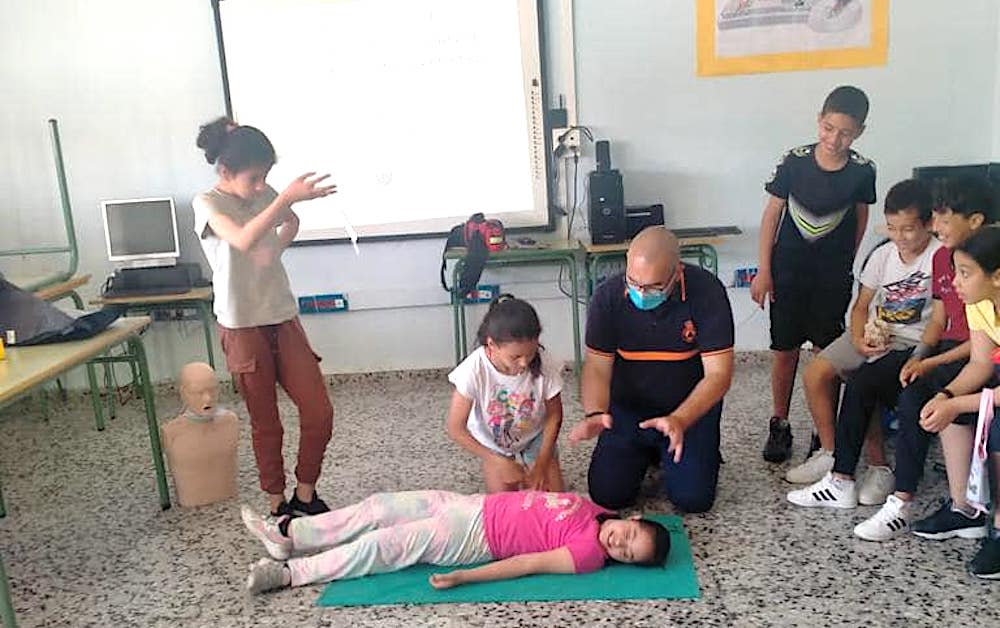 El jefe de Protección Civil de La Unión, Víctor Bélmez, resalta que estos primeros auxilios son básicos para que los más pequeños tomen conciencia sobre los protocolos a seguir ante cualquier emergencia a la espera del traslado del paciente a un centro de médico.