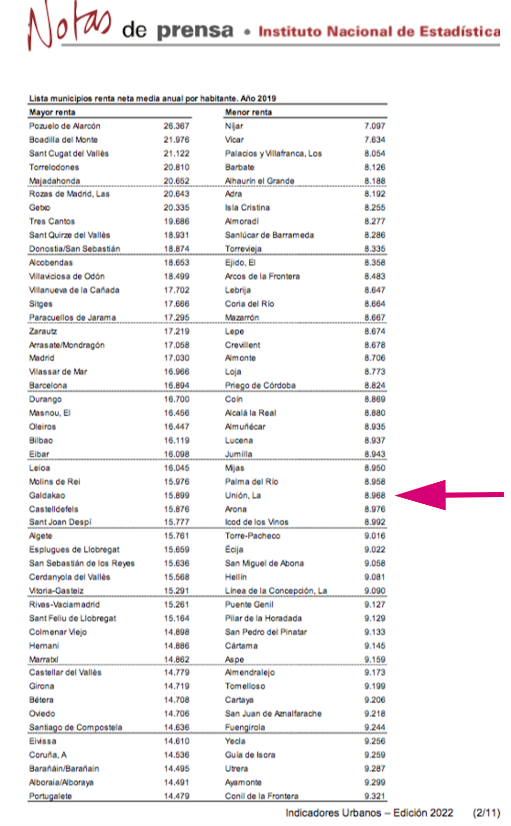 Según el ránking adjunto, La Unión ocupa el puesto 28 entre los de menor renta, con una renta per cápita de 8.968. Los otros municipios de la Región de Murcia ubicados en este top 50 presentan las siguientes cifras: Mazarrón (8.667 euros), Jumilla (8.943), Torre Pacheco (9.016), San Pedro del Pinatar (9.133) y Yecla (9.256).