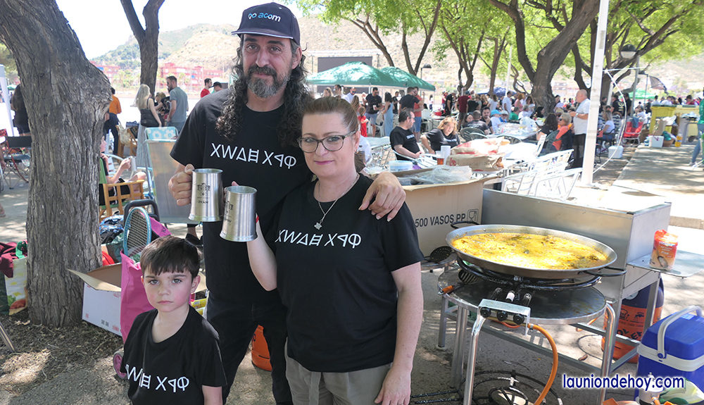 La familia formada por Iván, Consu y el pequeño Mizar se han enrolado en las fiestas de Carthagineses y Romanos como integrantes de la tropa de Quart-Hadast, la pionera del bando púnico. En la foto se les observa durante la multitudinaria convivencia que los festeros celebraron este fin de semana en el espacio que ocupa su gran campamento.