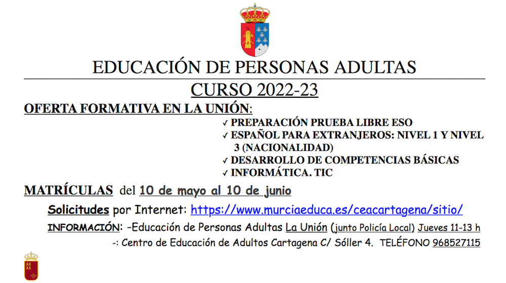 El plazo de matrícula para el curso 2022/23 seguirá abierto hasta el viernes de la próxma semana y aún quedan vacantes para la preparación de pruba libre de ESO y de idioma español nivel 3.