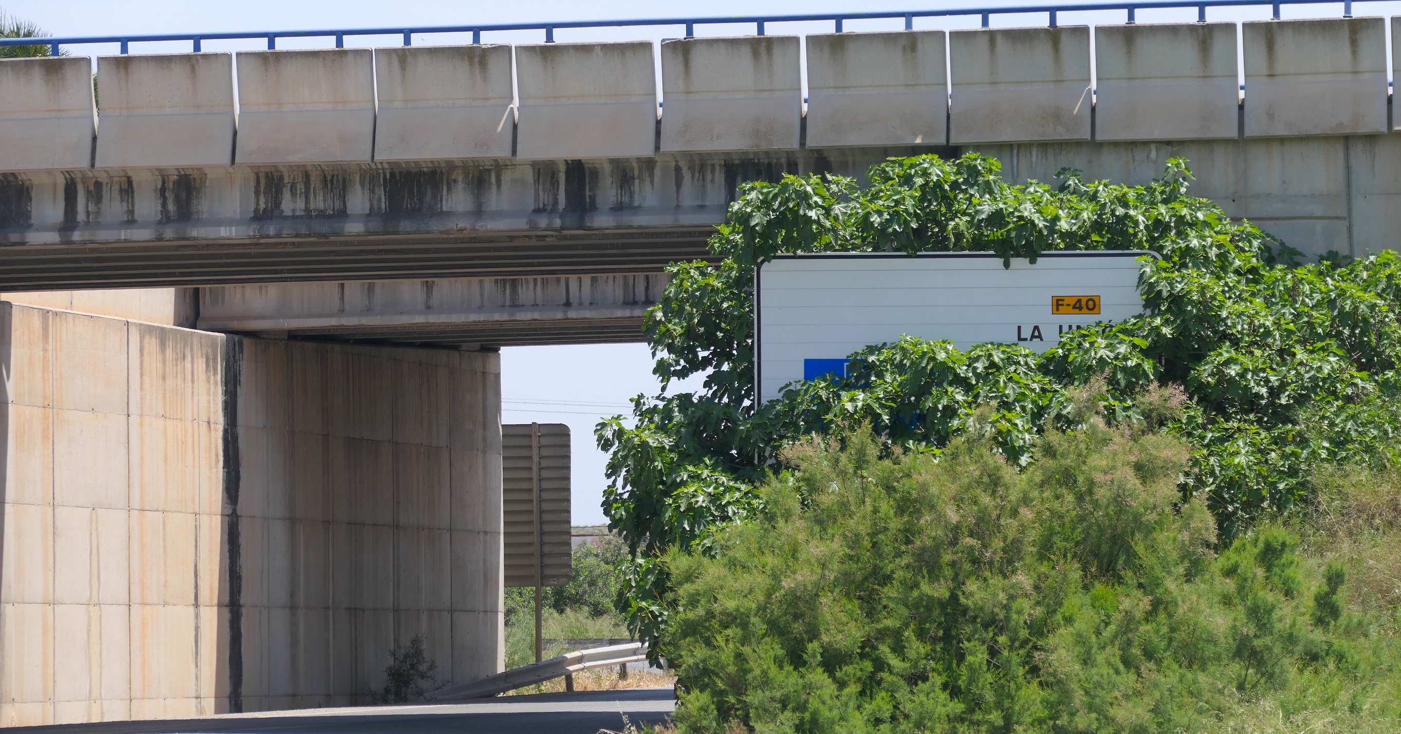 ¿Hacia dónde vamos?. Es lo que se puede preguntar un conductor que venga por Los Camachos o haya dejado la autovía cuando llega a la redonda, pues el cartel donde indica La Unión ha sido casi plenamente invadido por una higuera.