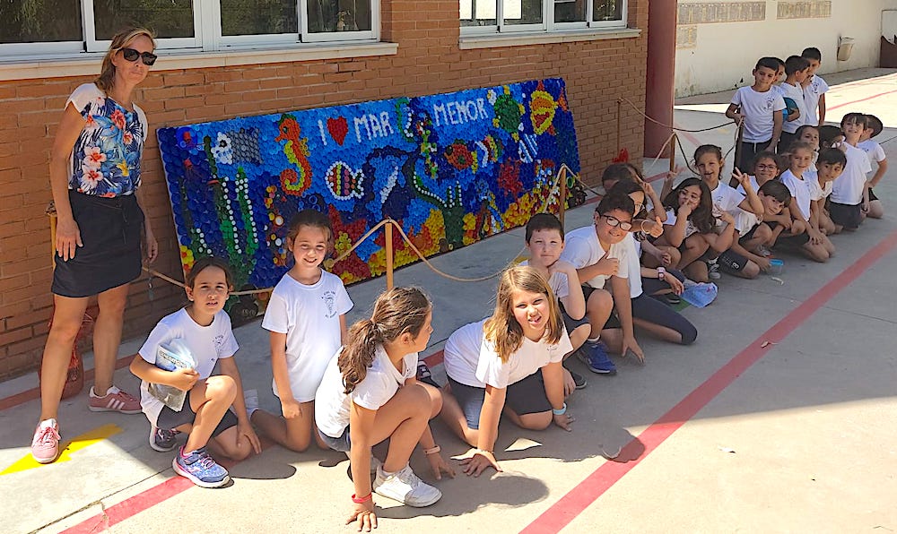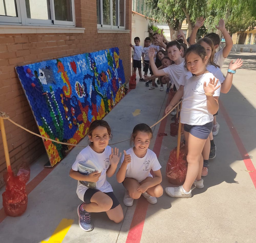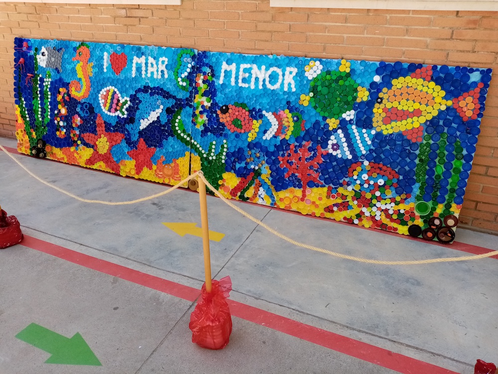 Bajo esta temática, y con motivo del ‘Día del medio ambiente’ y del ‘Día de la Región de Murcia, los alumnos del colegio de Nuestra Señora del Carmen de La Unión han elaborado un mural con tapones de plástico sobre la albufera.