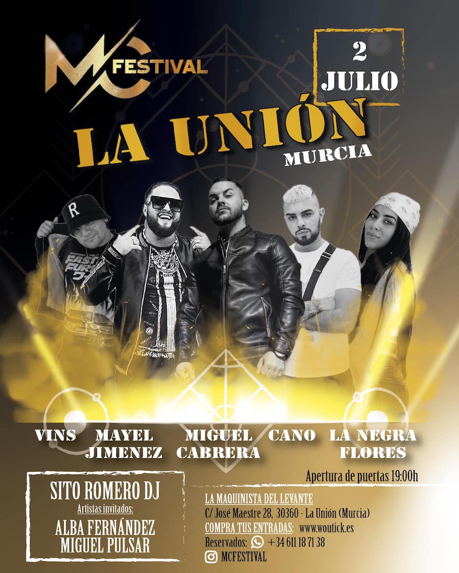 MC Festival anuncia las actuaciones de Vins, Mayel Jiménez, Miguel Cabrera, Cano, La Negra Flores, Sito Romero dj y, como invitados, Alba Fernández y Miguel Pulsar.