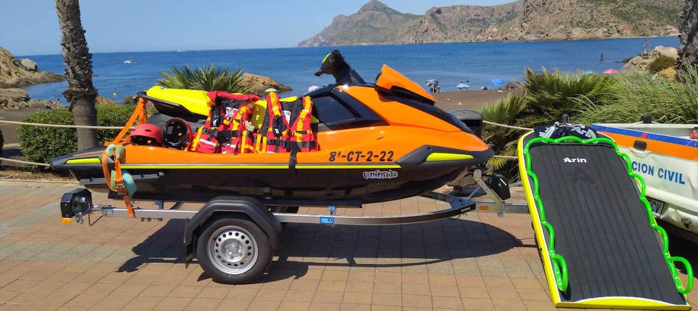 El Ayuntamiento de La Unión ha adquirido este kit completo de salvamento que incluye además de la moto, un remolque para su transporte y una camilla flotante para salvamento, además los EPIS para socorrista, chalecos flotantes y cascos homologados.