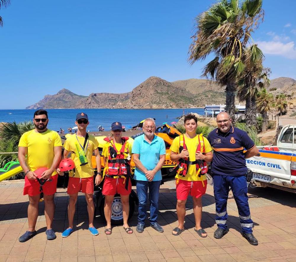 El concejal de Seguridad Ciudadana, José Solano, y el coordinador de Protección Civil de La Unión, Víctor Bélmez, han presentado esta mañana la nueva moto acuática que ha sido adaptada para el servicio de salvamento en las playas en Portmán.