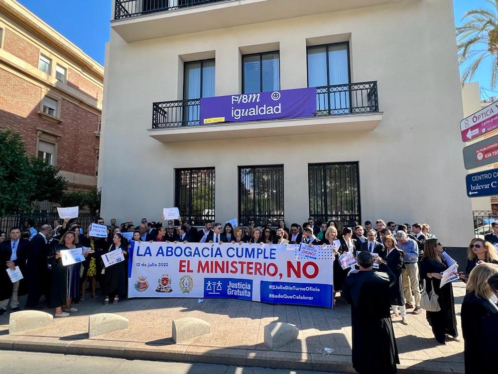 La protesta, convocada por los tres colegios de abogados del territorio autonómico (Murcia, Cartagena y Lorca) con sus decanos a la cabeza, exige el pago inmediato de las cantidades adeudadas a los letrados de oficio, que ya acumula cuatro meses de retraso (el 80% de marzo y los meses íntegros de abril, mayo y junio), así como la actualización de los baremos, puesto que en la actualidad la indemnización media por asunto apenas llega a doscientos euros. También solicitan acabar con la desigualdad existente en la remuneración entre los letrados que pertenecen a comunidades autónomas con las competencias de justicia transferidas y las que, en el caso de nuestra Región, pertenecen directamente al ministerio.
