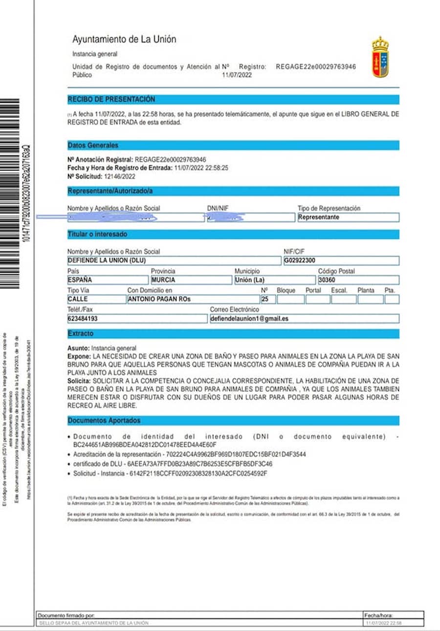 La formación Defiende La Unión ha presentado en el registro general del Ayuntamiento de La Unión la petición para que habiliten una zona o espacio en la playa de San Bruno de baño para perros o animales de compañía, "ya que también tienen derecho de ir con sus dueños de disfrutar de unas horas de playa o baño. En algunos municipios de costa ya se están habilitando y creemos que puede ser una buena oportunidad para seguir progresando en el bienestar animal y que sus dueños puedan también disfrutar con sus perros de un día de playa", indican.