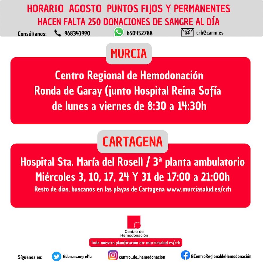 El centro de hemodonación de la Región de Murcia estará en el centro de salud de La Unión los dos próximos martes, días 2 y 9 de agosto, a partir de las 17.30 horas. Los interesados en donar sangre deben llevar su documento nacional de identidad.