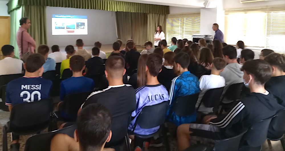 Alumnos del colegio de Nuestra Señora de Carmen de La Unión escucharon (y preguntaron después) a Vanessa Aranda Quirós (en el centro en la foto inferior), doctoranda en Gestión y Conservación del Mar por la Universidad de Cádiz, en la conferencia medioambiental 'Microplásticos, una pandemia invisible. Presencia en diferentes compartientos ambientales y sus efectos tóxicos'.