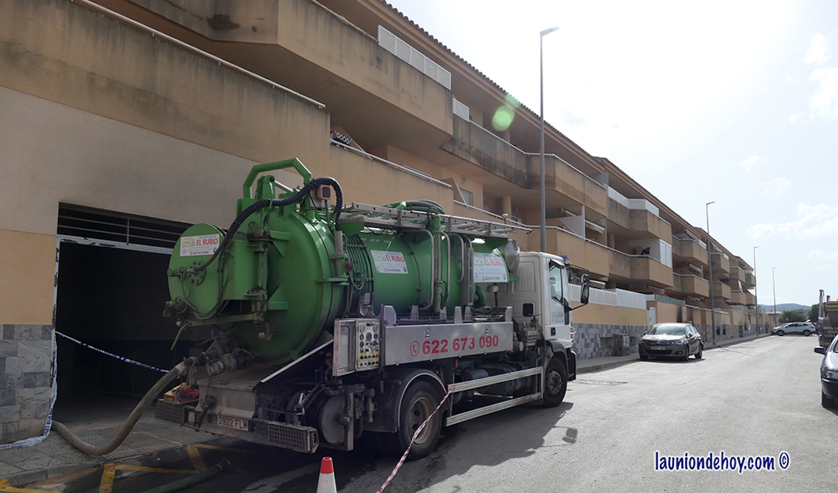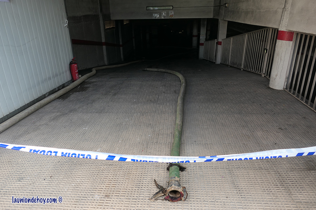 También ayer siguió actuando la cuba de agua enviada por Acciona a instancias del Ayuntamiento de La Unión. Su labor concluía a la una y media de la tarde, pero la comunidad de propietarios decidió pagarle horas extras para que llevase a cabo un trabajo más completo de evacuación de agua en el garaje. Al garaje no se puede acceder al estar con el precinto policial. Ver el negror interior ya impresiona, pudiéndose observar también las huellas del incendio por las pequeñas ventanas que tiene el sótano hacia el exterior.