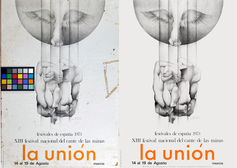 El Archivo Municipal ofrece esta semana un artículo sobre una de sus funciones principales, que es el proceso de convertir un documento físico en una representación digital para potenciar la seguridad de su permanencia en el tiempo, además de que en bastantes ocasiones sirve para mejorar el original, como se observa en el cartel obra de Paco Conesa adjunto. La Unión tiene actualmente digitalizados documentos desde las actas capitulares de 1860.