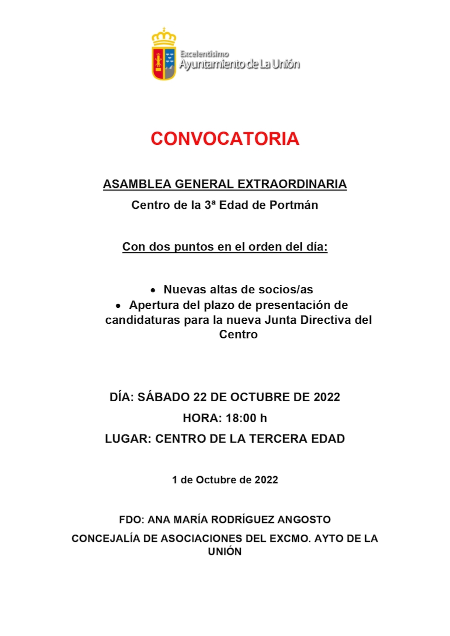 Con carácter extraordinario, se celebra este sábado en el centro de la tercera edad e incluye en su orden del día la apertura de presentación de candidaturas para nueva junta directiva.