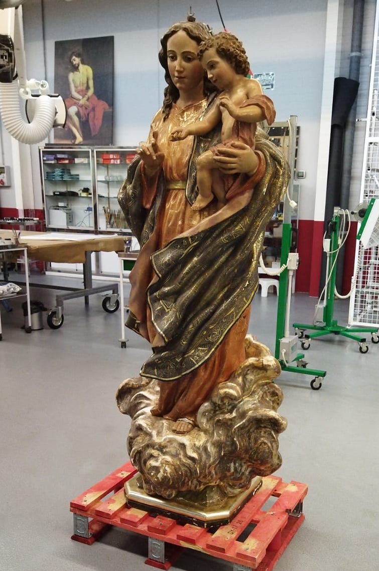 Esta mañana ha llegado al Centro Regional de Restauración de la Región de Murcia la imagen de la Santísima Virgen del Rosario de La Unión, alcaldesa perpetua del municipio, para proceder a su restauración y así subsanar algunos desperfecto en la pintura y en la talla generados por el paso del tiempo.
