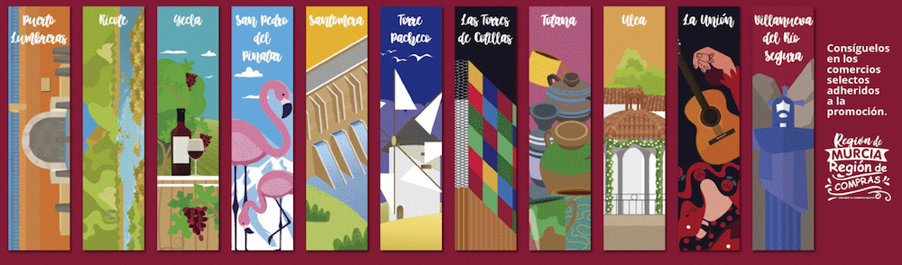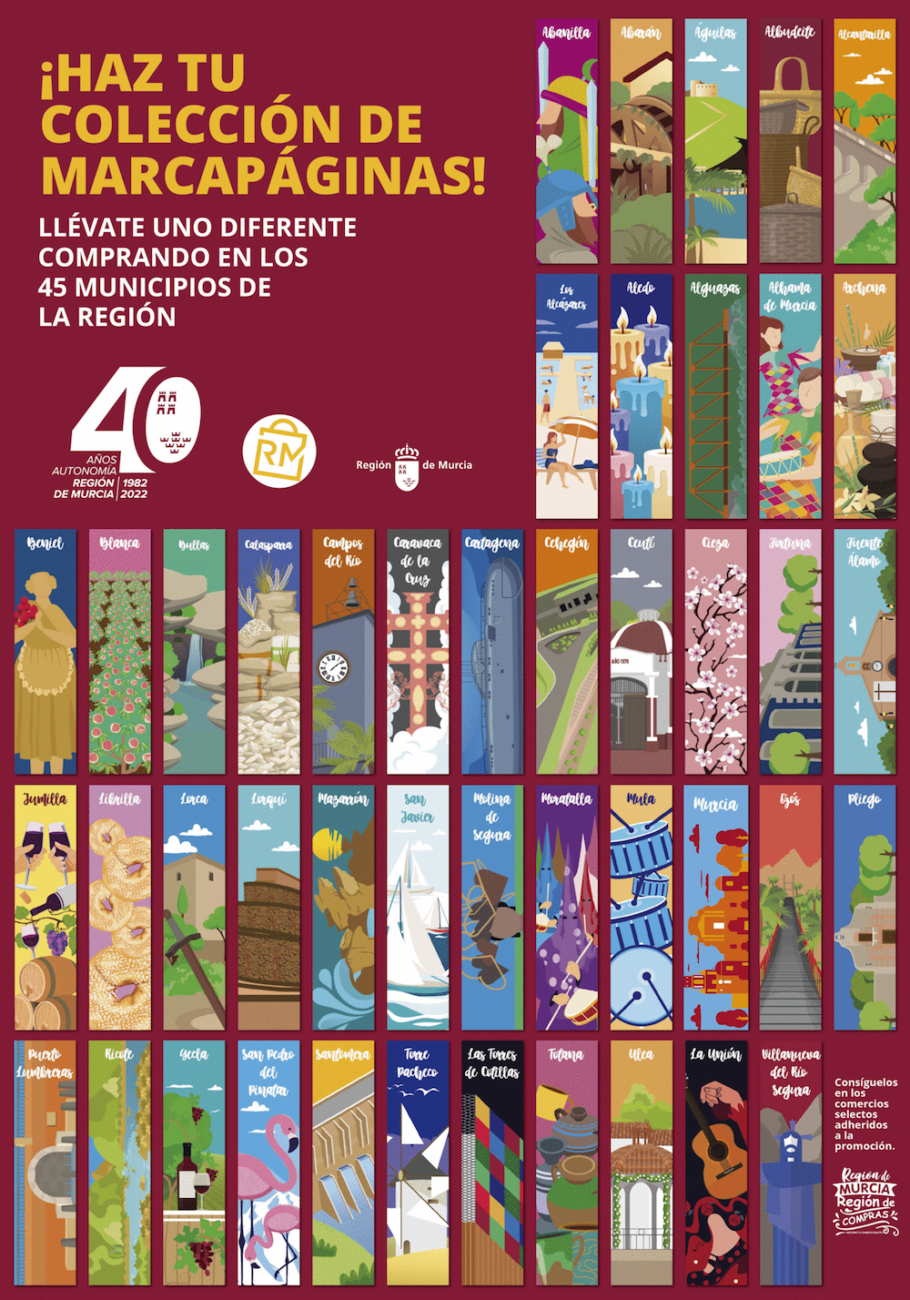 Se han diseñado 45 marcapáginas, uno por cada municipio, con imágenes significativas de cada localidad como la Catedral de Murcia, la floración de Cieza, la Cruz de Caravaca, el submarino de Cartagena, la tamborada de Mula, el Cante de las Minas de La Unión, el pantano de Santomera, los flamencos de San Pedro del Pinatar, el castillo de Lorca, el vino de Jumilla y Yecla y la noche en vela de Aledo, que se podrán obtener por compras en comercios adheridos a esta campaña. Cada ayuntamiento decidirá la cuantía mínima de la compra para obtener de regalo los marcapáginas, que son coleccionables.
