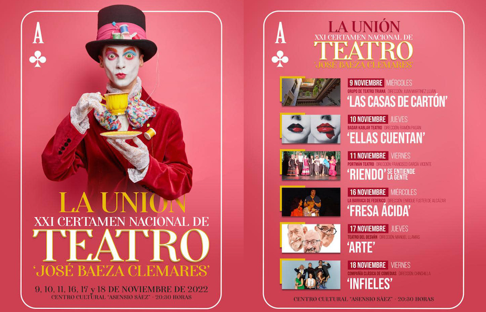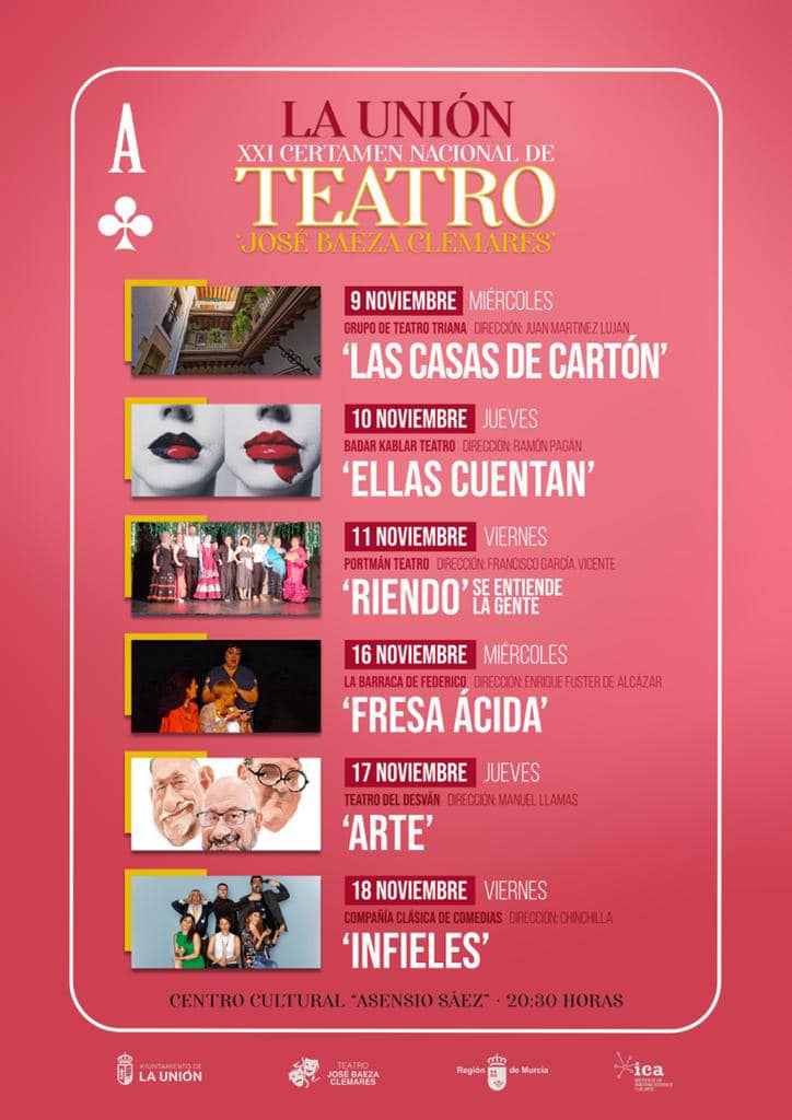 ‘Las casas de cartón’, ‘Ellas cuentan’, ‘Riendo… se entiende la gente’, ‘Fresa ácida’, ‘Arte’ e ‘Infieles’ son las obras que se representarán en el centro cultural ‘Asensio Sáez’ del 9 al 18 de noviembre. Las compañías que actuarán son, respectivamente, grupo de teatro Triana, Badar Kablar Teatro de La Unión, Portmán Teatro, La barraca de Federico, Teatro del desván y Compañía clásica de comedias. Todas las sesiones comenzarán a las 20.30 horas, con entrada gratuita. La cita tiene un carácter solidario, pues permitirá ayudar a los afectados por la riada en Javalí Viejo (Región de Murcia).
