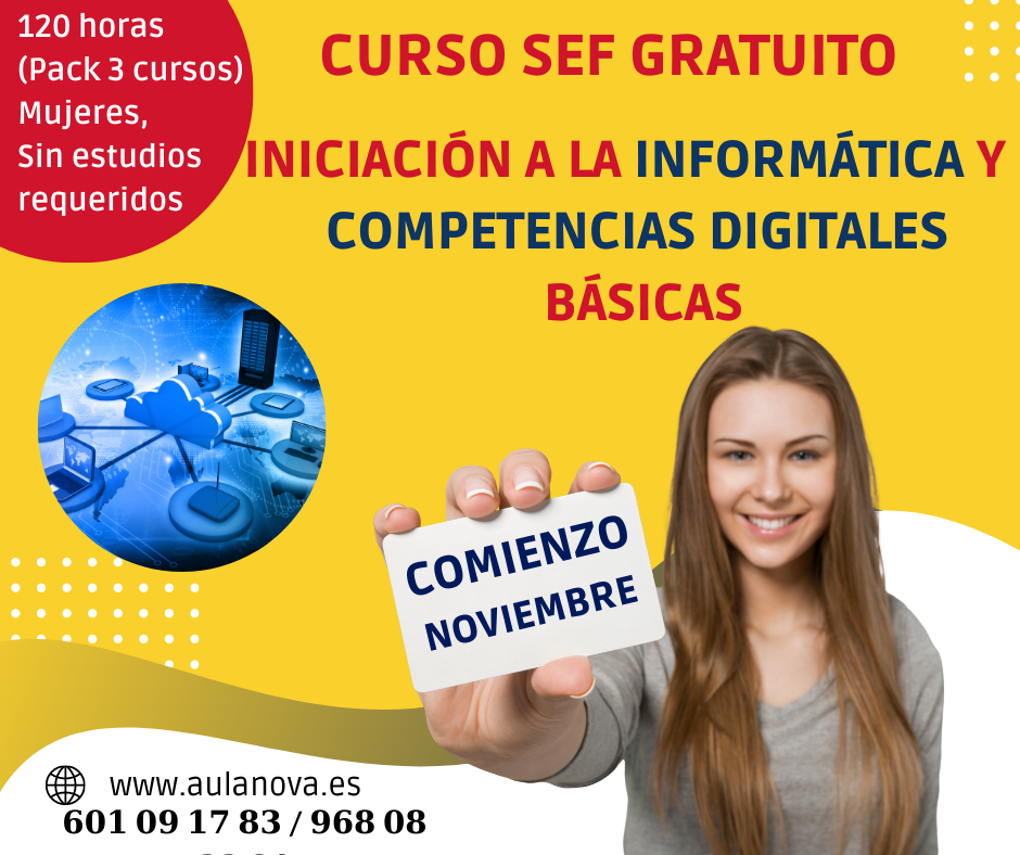 Se trata de un un pack de 3 cursos de 120 horas que en la actualidad es imprescindible para cualquier trabajo y para tu día a día. Te puedes formar en tu centro de formación Aula Nova de La Unión, donde comenzarán el día 22 de este mes las clases con un máximo de 10 alumnos, por lo que te debes apuntar enseguida para asegurar la plaza. Es totalmente gratuito. Si necesitas más información no dudes en contactar con nosotros por teléfono o pasando por nuestras instalaciones de la calle Sor Virtudes López.