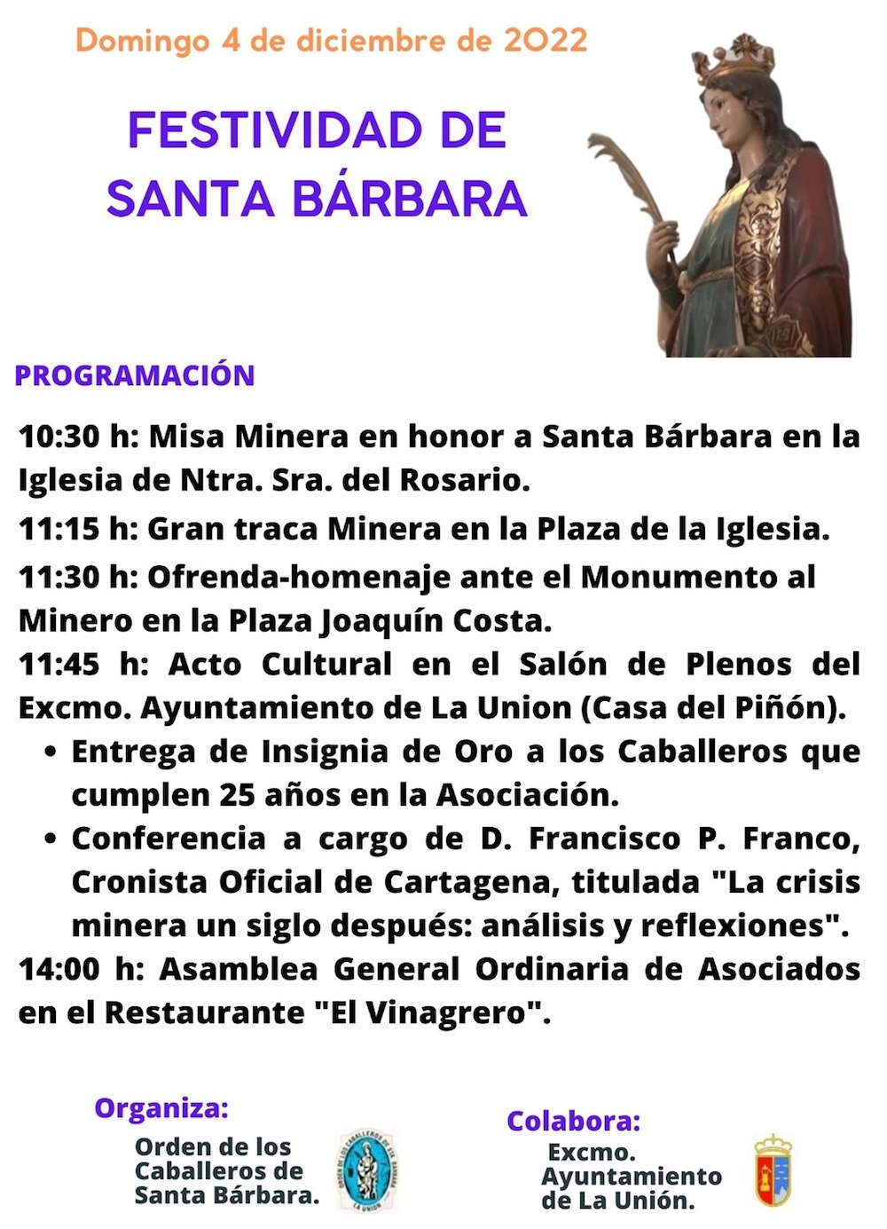 La orden unionense celebra este domingo la festividad de la patrona de la minería con una misa minera, una gran traca minera, la ofrenda y homenaje al monumento al minero, la entrega de insignias de oro, una conferencia y la asamblea general. La foto muestra a representantes de la asociación cultural ante la santa que les da nombre en la celebración de un año atrás.