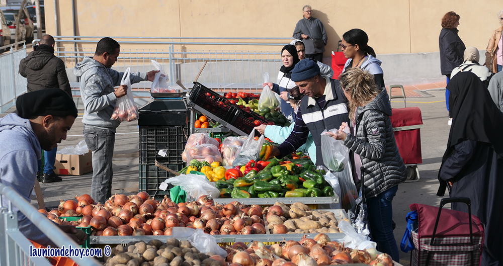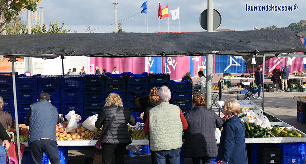 Hoy es cuando se han instalado los puestos de la fruta en la explanada del polideportivo y los de ropa y otros productos en las calles Mayor y Sor Virtudes López debido a que este martes es la fiesta de La Constitución española.