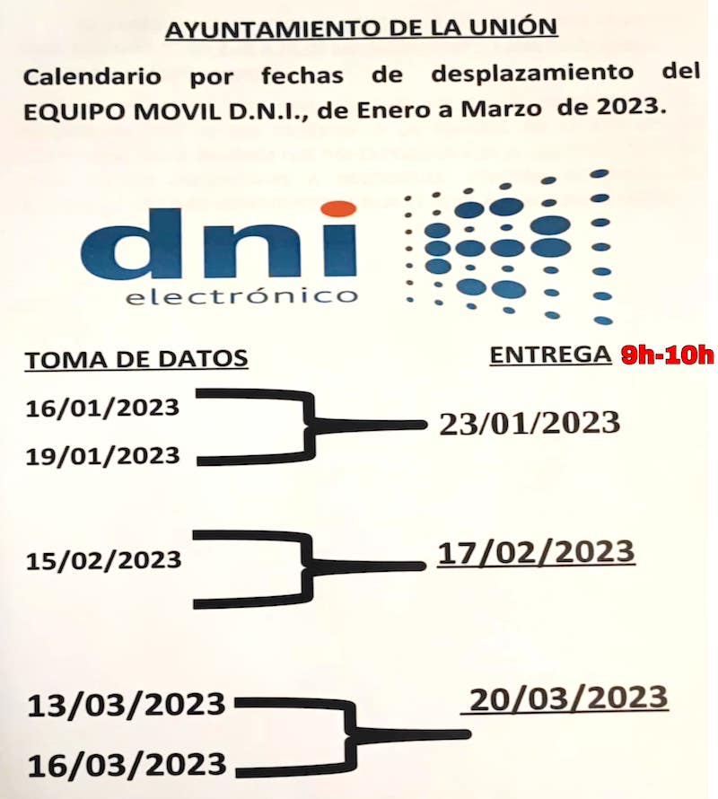 El equipo móvil de la Comisaría de Policía Nacional tomará en la sede del Ayuntamiento de La Unión los datos para expedición y renovación en cinco fechas del primer trimestre del nuevo año.