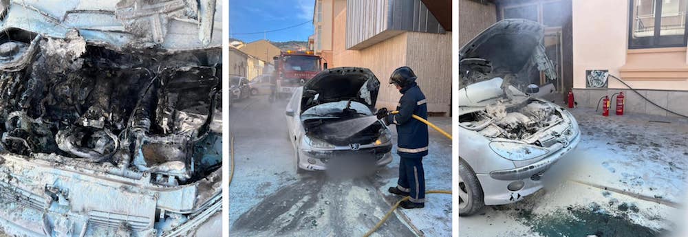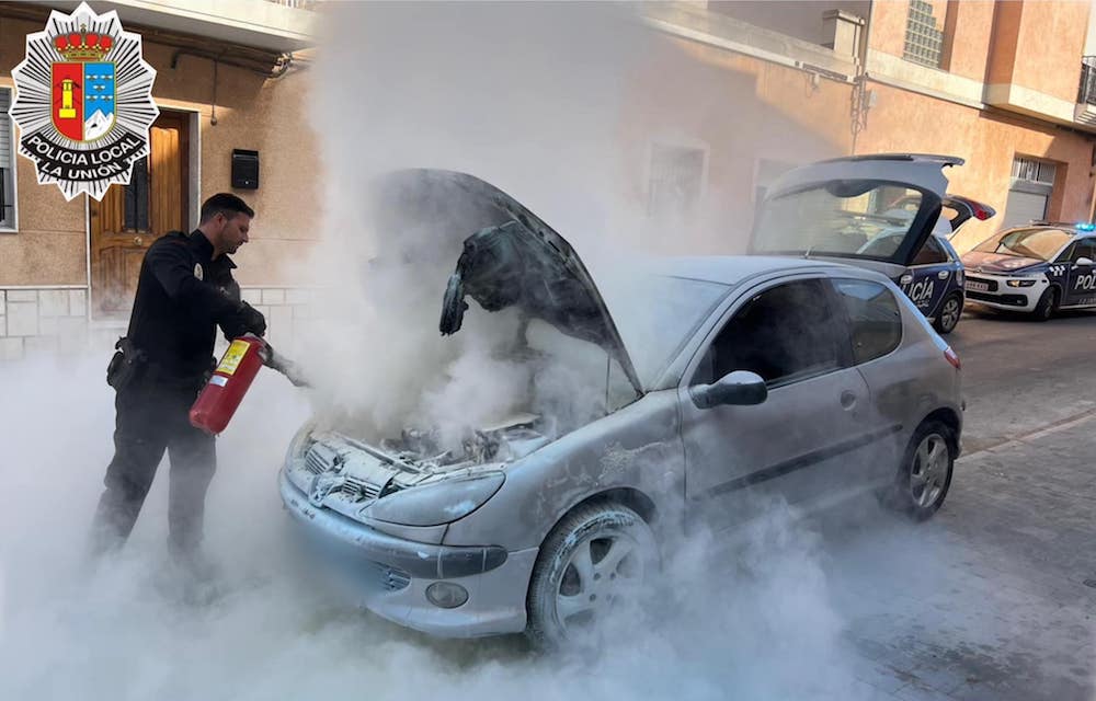 Escenas del incendio en un vehículo, por motivos de origen eléctrico, que fue sofocado por agentes de la Policía Local de La Unión con extintores.