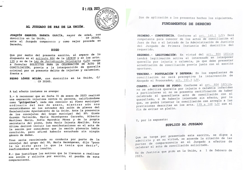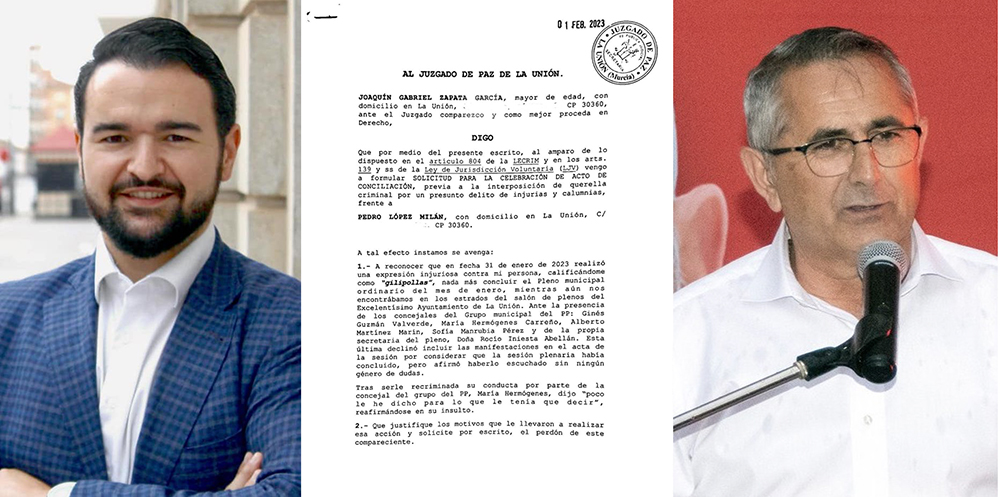 Esta misma mañana, Zapata ha denunciado los hechos ante el Juzgado de Paz de La Unión mediante la formulación del preceptivo acto de conciliación, al objeto de depurar las responsabilidades legales en las que ha incurrido Pedro López.