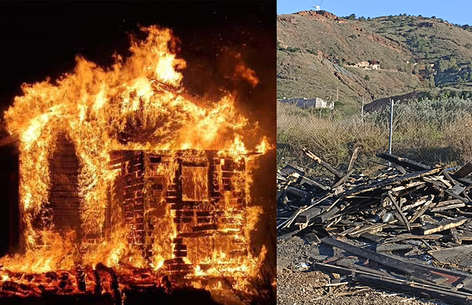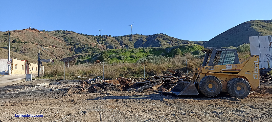 La oficina de madera ubicada en el inicio de la subida del Camino del 33 fue envuelta ayer por las llamas, quedando reducido todo a escombros, los cuales están siendo retirados durante la jornada de hoy con una pequeña pala mecánica y un camión. Esta caseta estaba abandonada en los últimos años debido al cierre del Parque Minero.