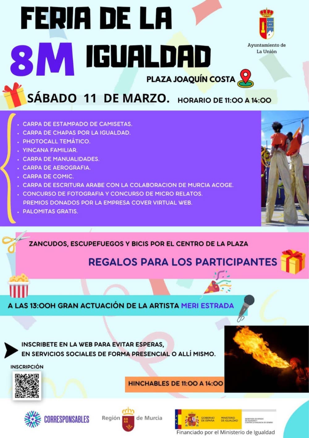 La plaza de Joaquín Costa, dentro de los actos del 'Día internacional de la mujer', acoge el 11 de marzo diversas actividades y animaciones, como talleres de estampados en camisetas, chapas, cómic, escritura árabe o aerografía, además de una yincana familiar, palomitas gratis, concursos de fotografía y microrrelatos, zancudos y esucpefuegos, actuación de Meri Estrada, hinchables, etc.