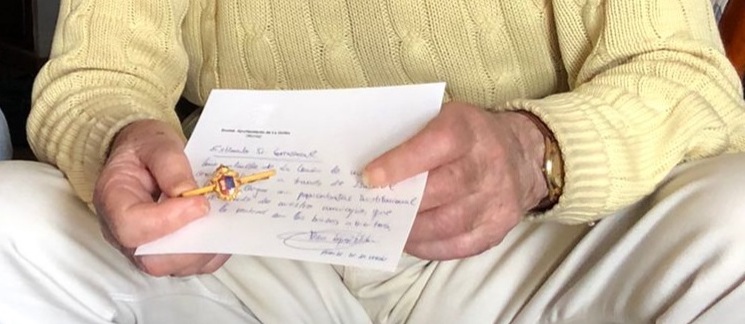 José María Carrascal muestra una carta escrita por el alcalde de La Unión y un pisacorbatas con el escudo del municipio. Foto: María Nortes Pérez