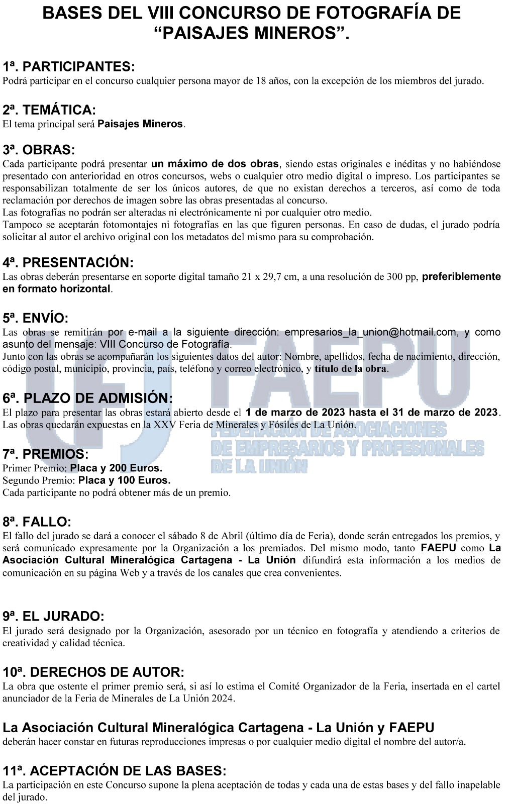 El certamen organizado por FAEPU en el marco de la vigésimo quinta edición de la 'Feria de minerales y fósiles' de La Unión cierra el plazo de entrega de imágenes este próximo viernes y entregará dos premios, respectivamente, de 200 y 100 euros. La obra del ganador será el cartel anunciador de la edición de 2024.
