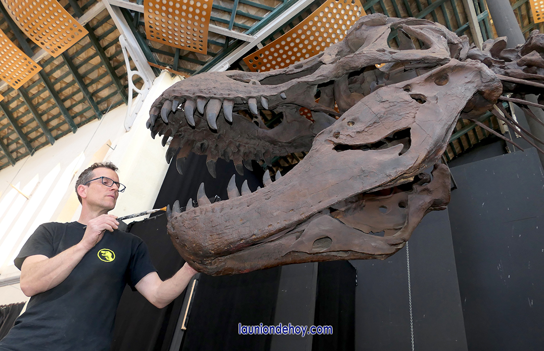 Durante la jornada de hoy se está llevando a cabo la instalación de un esqueleto de 'Tyrannosaurus Rex' a escala real en el escenario del Mercado Público, que podrá ser contemplado por los visitantes de la XXV Feria de Minerales y Fósiles de La Unión que se celebra desde este jueves.