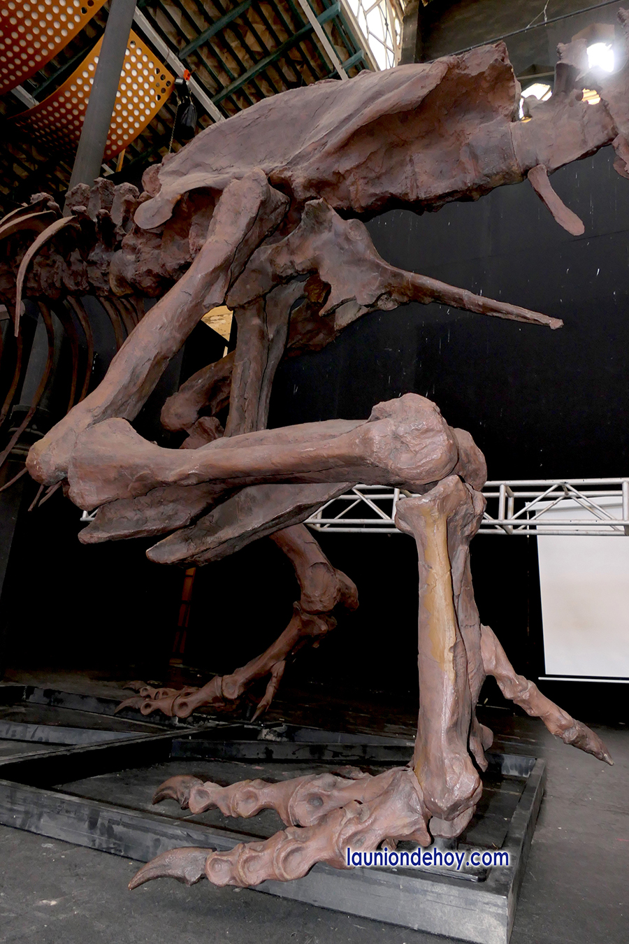Los trabajos de instalación de este esqueleto de 12 metros de longitud lo llevan a cabo trabajadores de la empresa 'Paleomundo'. La feria se desarrolla desde el Jueves Santo hasta el sábado, con horario de apertura diario a las 10, estando fijado el acto protocolario de inauguración y de homenaje al minero para este 6 de abril a las 11 horas.