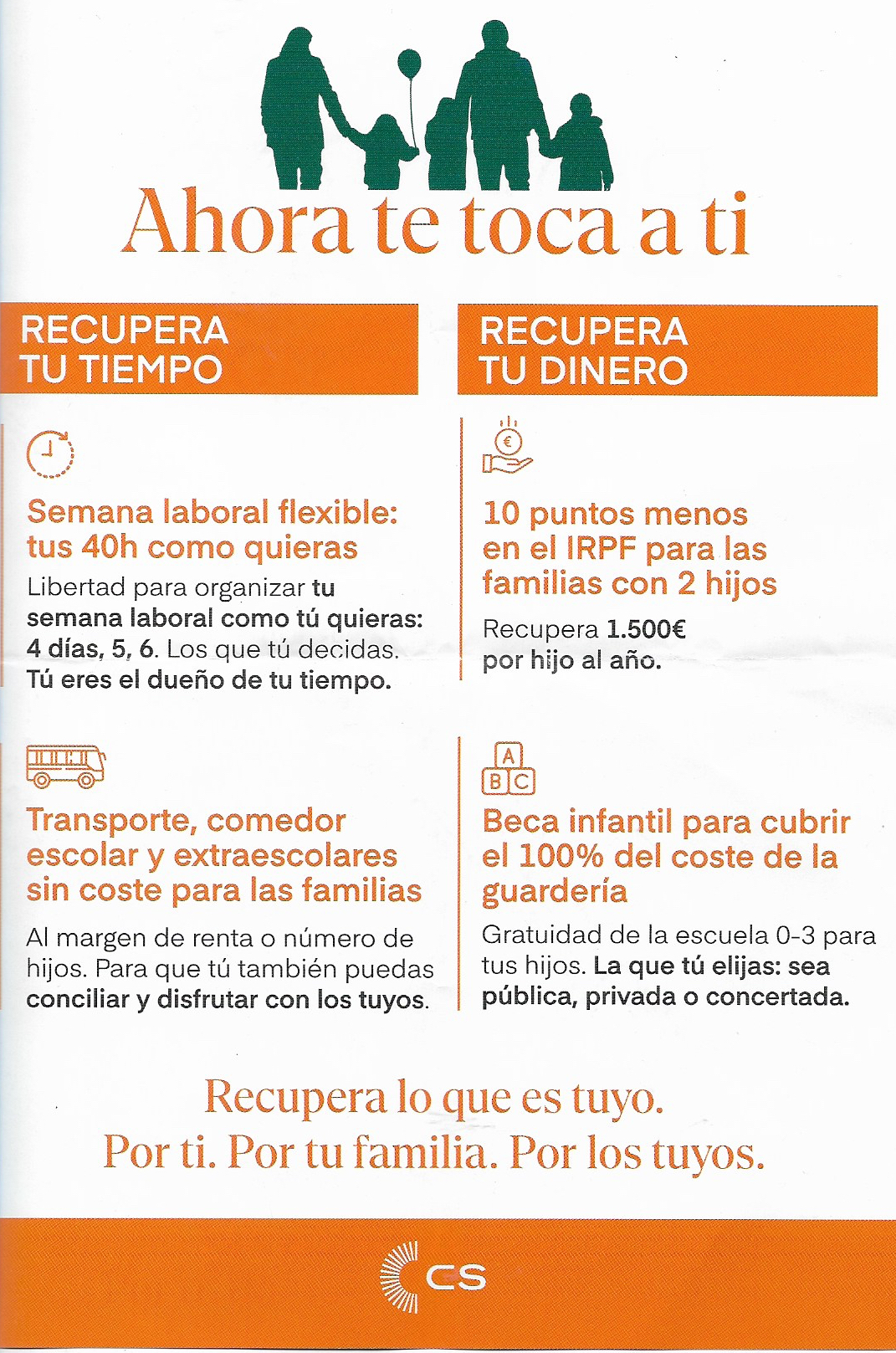 Por último, Cs también hizo hincapié (distribuyendo folletos) en la campaña regional: 'Ahora te toca a ti', frase a la que se suman 'Recupera lo que es tuyo. Por ti. Por tu familia. Por los tuyos'.