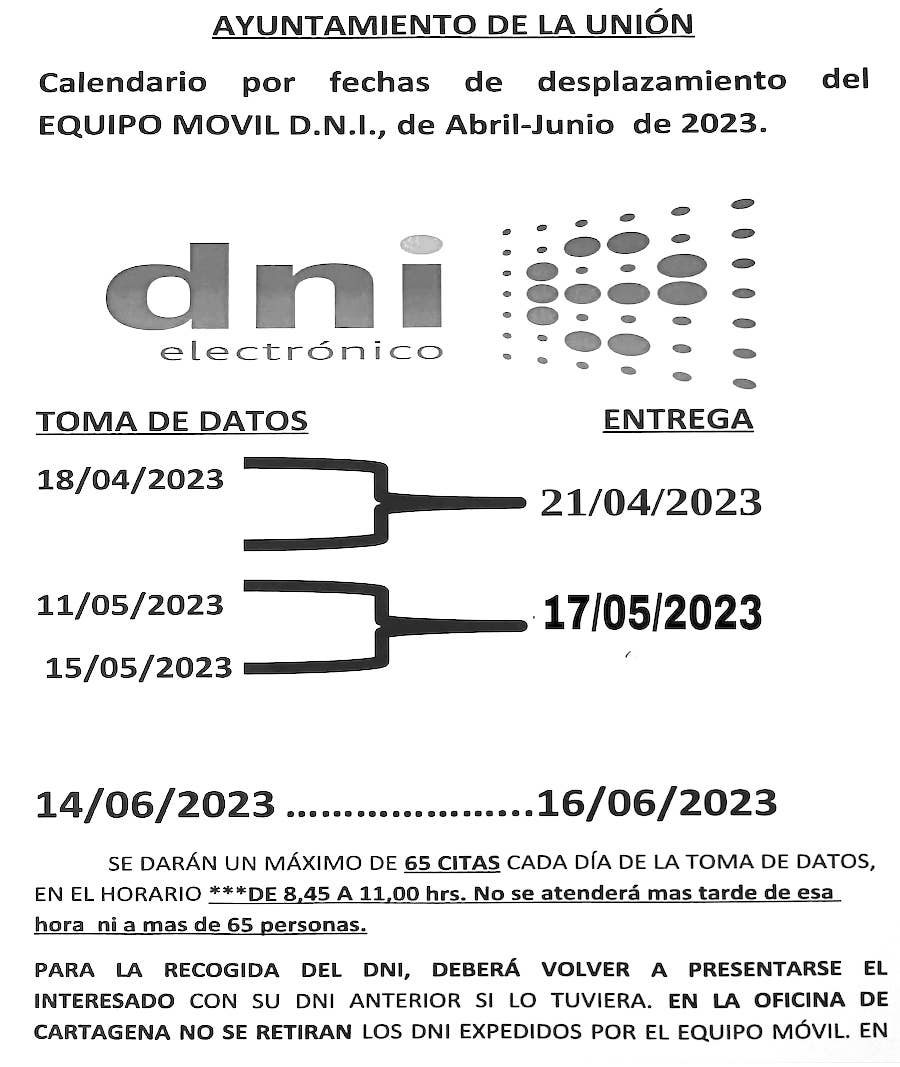 Policía local informa de las fechas en que el personal de la Comisaría de Policía Nacional de Cartagena estará en La Unión en los dos próximos mes para renovación y expedición del documento nacional de identidad.
