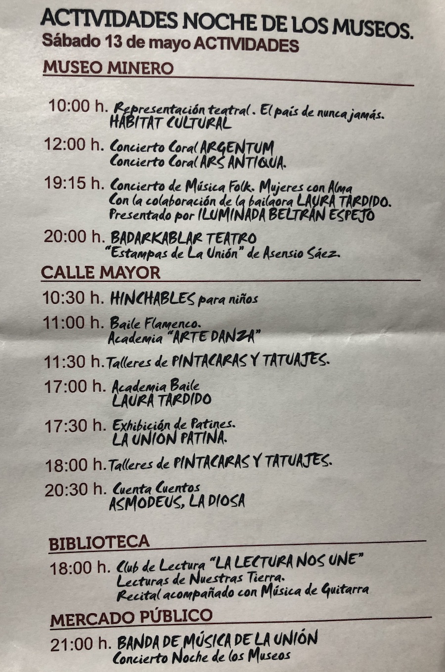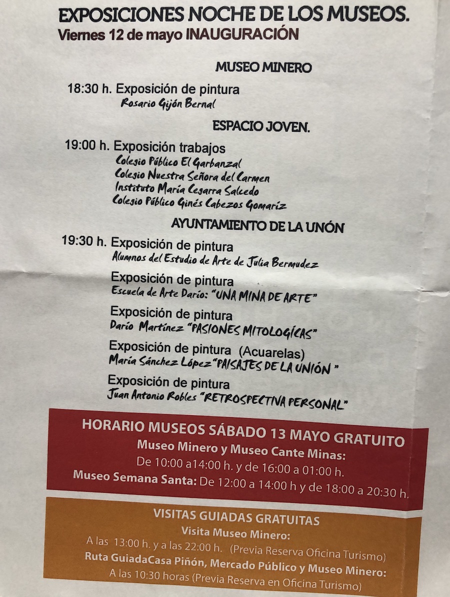 Rosario Gijón Bernal es la autora del cartel anunciador de la 'Noche de los museos' en La Unión, que se va ha celebrar los días 12 y 13 de mayo con un amplio programa de actividades (principalmente relacionadas con la música) y visitas a centros museísticos, además de exposiciones de los artistas locales. Ofrecemos guía de actividades, horarios y escenarios.