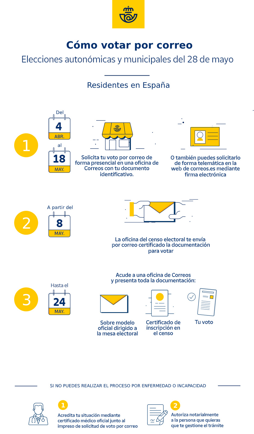 Dada la celebración de días festivos en diferentes localidades de España en fechas próximas a las elecciones autonómicas y municipales, se recomienda a los ciudadanos que deseen ejercer su derecho al voto por correo que procuren no esperar hasta el último día y que aprovechen la amplitud horaria de las oficinas postales.