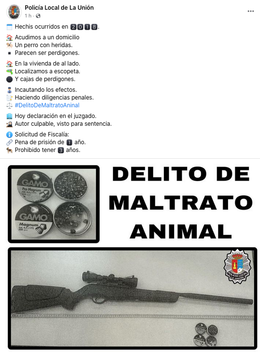 La Fiscalía solicita un año de prisión y la prohibición de tenencia de animales durante un período de tres años para un vecino de La Unión como presunto autor de un delito de maltrato animal. En el juicio, celebrado hoy, han declarado agentes de la Policía Local, que fueron quienes localizaron la escopeta y las cajas de perdigones cuando, en el año 2018, acudieron al domicilio donde estaba el can con heridas.