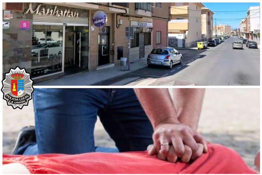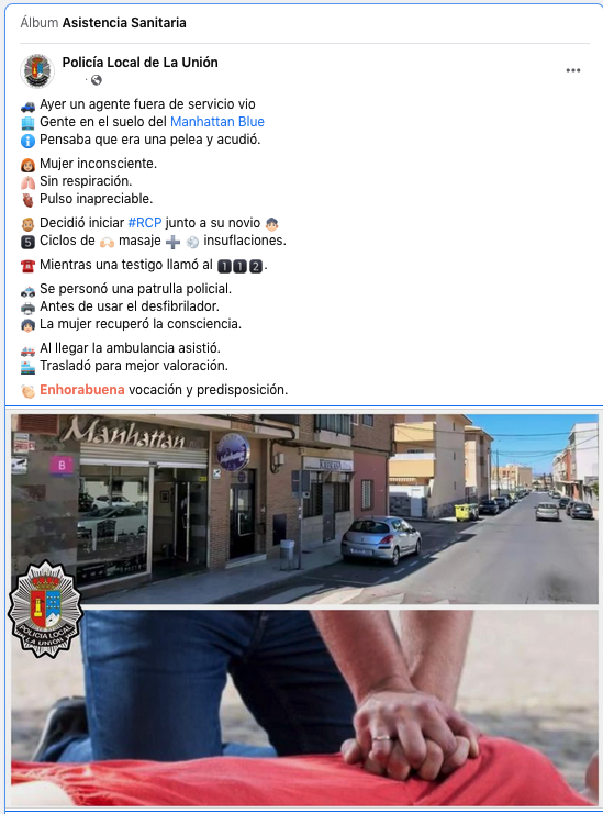 Un agente de la Policía Local de La Unión, quien estaba fuera de servicio, acudió a un bar de la calle Carrera de Irún donde se encontraba una persona sin respiración, iniciando, junto a su novio, la reanimación cardiopulmonar (RCP). La mujer recuperó la consciencia sin necesidad de utilizar el desfibrilador que llevaba un coche patrulla policial que llevó poco después. Fue trasladada a centro sanitario para una mejor valoración.