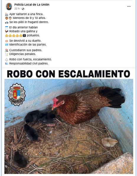 La Policía Local de La Unión informa que dos menores, de 9 y 10 años de edad, fueron pillados 'in fraganti' dentro de una finca donde habían cogido una gallina y cinco polluelos, que fueron devueltos a su dueño. Los zagales fueron entregados a sus padres, abriéndose diligencias penales por robo con fuerza y escalamiento.