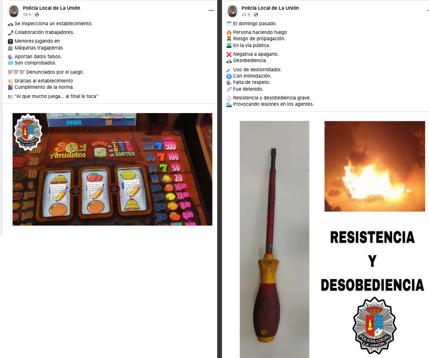 La Policía Local de La Unión informa que un hombre se negó a apagar un fuego que había encendido en la vía pública e intimidó a los agentes con un destornillador, causando lesioens. Fue detenido. Por otro lado, un establecimiento hostelero de la ciudad ha sido denunciado por permitir que tres chavales estuvieran jugando a las tragaperras.